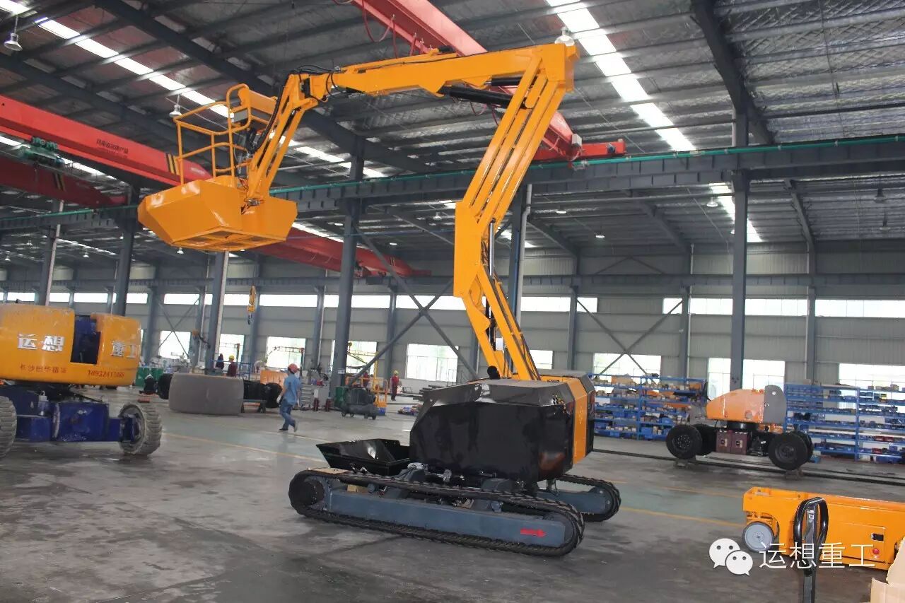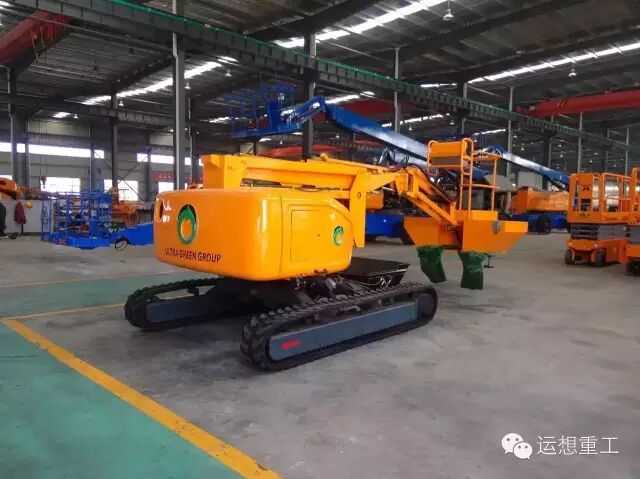 2015年,运想重工研发了用于采摘水果的高空作业果园机,上升高度可达7m~15m。改果园机有直臂式、曲臂式两种臂架形式。轮胎有履带式、轮胎式两种选择。这是一种集采摘、修剪、喷药、运输、动力发电等功能的自走式作业机。该作业机的研制成功标志着我国果园单一的采摘机械进入到了多功能作业机械时代,示意图所示。